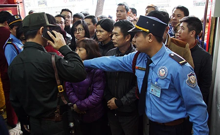 Tại cửa hàng vàng 349 Cầu Giấy của Công ty Vàng bạc Bảo Tín Minh Châu, lượng người đến mua vàng ngày thần tài xếp hàng đông đảo từ vỉa hè ngoài cửa hàng. Lực lượng công an cũng có mặt hỗ trợ. Ảnh: Phi Hùng.