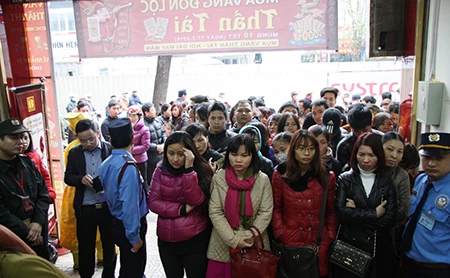 Theo khảo sát của PV, tại một vài địa điểm bán hàng ở Hà Nội, hiện tượng người dân xếp hàng dài mua vàng ngày thần tài diễn ra phổ biến. Để mua được vàng thần tài ưng ý nhiều người thậm chí đến xếp hàng từ lúc mờ sáng. Ảnh: Phi Hùng.