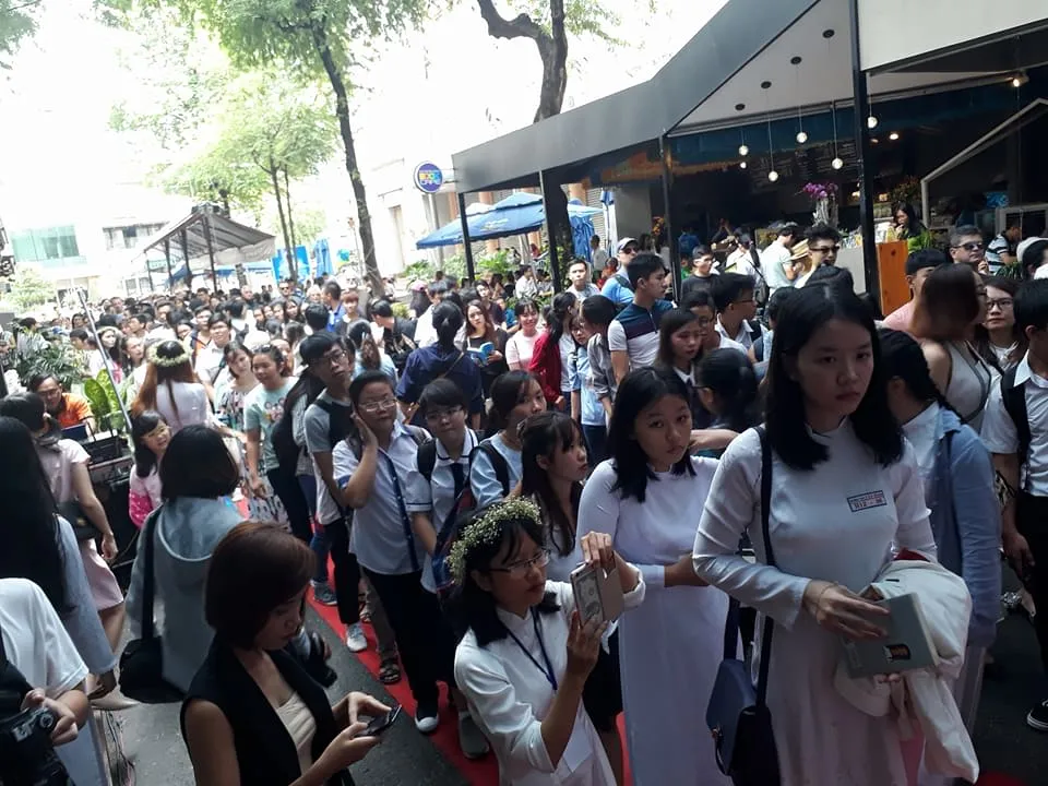 Đọc giả tuổi teen từ cấp 1, cấp 2 đến sinh viên xếp hàng đông chật kéo dài từ địa điểm tổ chức sự kiện kéo dài ra đến rìa Đường Sách.