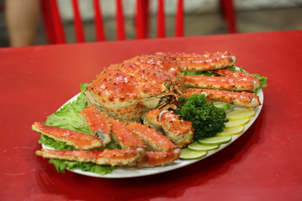 Với món cua hoàng đế được bắt sống từ trong bể và chế biến trực tiếp ngay tại quán nên đảm bảo cua luôn tươi ngon và thịt cua cũng rất săn chắc. Loại cua này có đến bốn cặp càng lớn, thịt cua ngọt nên chỉ cần hấp chín là có thể thưởng thức trọn vẹn vị ngon của nó.