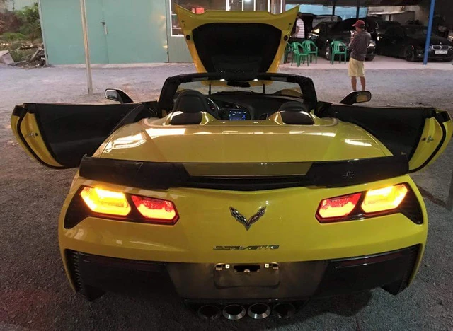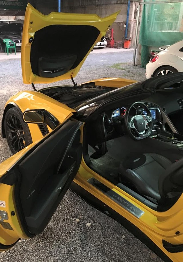 Chiếc Chevrolet Corvette C7 Z06 Convertible đầu tiên xuất hiện tại Việt Nam được sơn màu vàng nổi bật và đi kèm hai gói phụ kiện bằng sợi carbon.