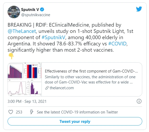 Một nghiên cứu mới từ Argentina đã chỉ ra rằng chỉ cần một liều vaccine ngừa COVID-19 Sputnik V do Nga sản xuất có thể giúp giảm nguy cơ nhiễm COVID-19 ở mức độ nặng đối với người cao tuổi so với những loại vaccine khác.
