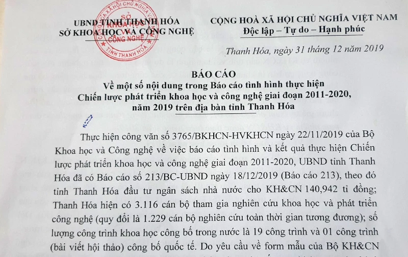 Báo cáo của Sở KH&CN tỉnh Thanh Hóa. Ảnh: ĐẶNG TRUNG