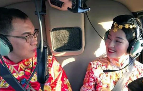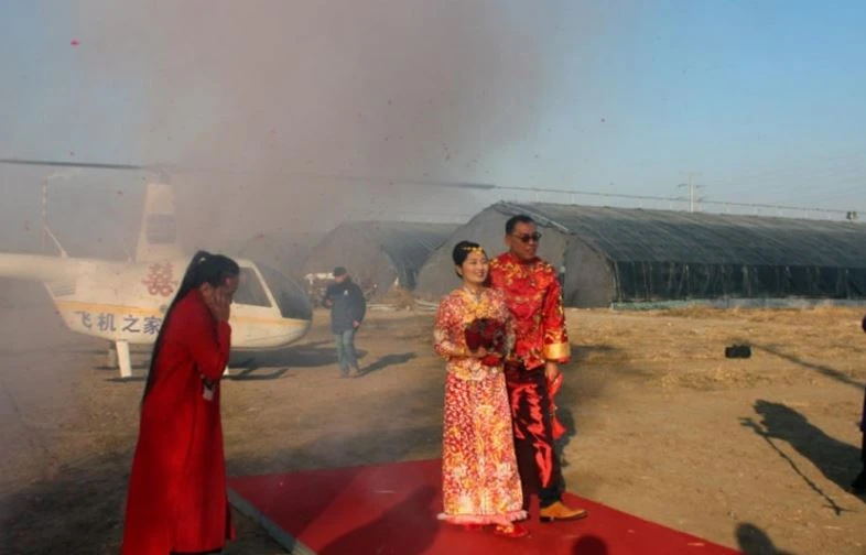 Trong ngày cưới, chú rể này đã bay khoảng một giờ bay từ TP Tân Châu ở Bắc Sơn Đông để rước dâu. Sau đó anh sẽ đưa nàng dâu của mình đến thẳng trung tâm tiệc cưới ở Tri Bác.