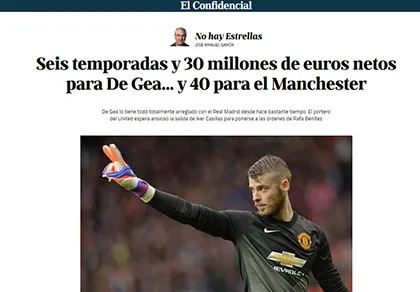 Bài viết của nhà báo Jose manuel Garcia tờ El Confidencial cho rằng 2 CLB Manchester United và Real Madrid đã thống nhất mọi điều khoản về thương vụ chuyển nhượng David De Gea. Mọi việc sẽ được 2 CLB chính thức công bố ngay sau khi thủ thành Iker Casillas rời khỏi Bernabeu để tới FC Porto (Bồ Đào Nha).