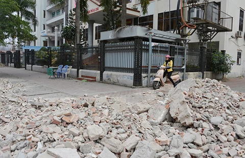 Xung quanh vỉa hè mặt tiền của Chi cục Thuế Hạ Long vẫn còn những dải phế liệu chặn đường đi lên vỉa hè. Ảnh: ĐT