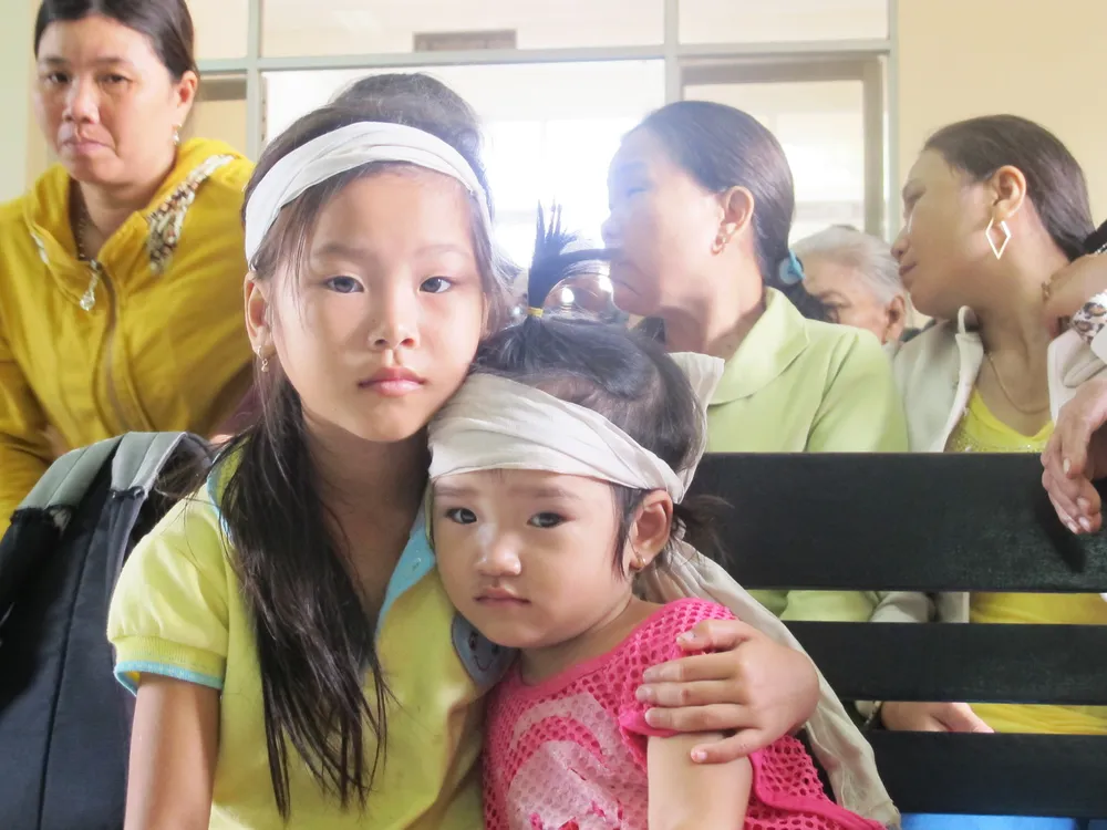 Hai đứa con của nạn nhân Ngô Thanh Kiều ngồi co cúm sợ hãi giữa phiên tòa sáng nay. Cháu Ngô Thị Thanh Thảo (8 tuổi) ôm em là Ngô Thị Kim Oanh (sinh ngày 1-6-2012, sau khi anh Kiều bị đánh chết).