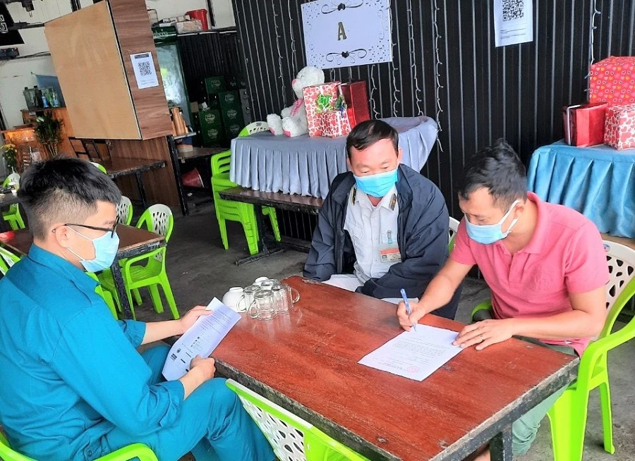 Một cơ sở kinh doanh ở quận Ngũ Hành Sơn ký cam kết thực hiện nghiêm các quy định phòng, chống dịch khi mở cửa trở lại. Ảnh: T.AN