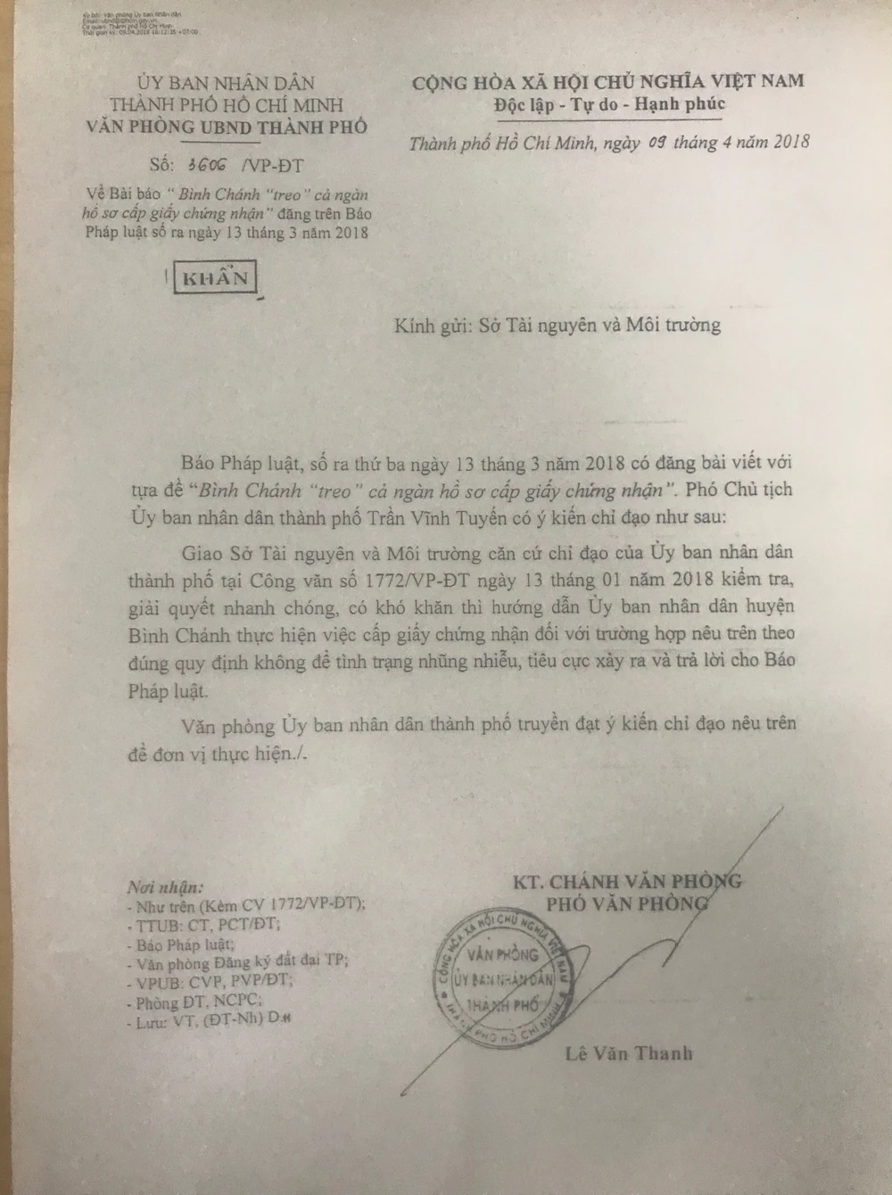 Sau khi Pháp Luật TP.HCM đăng bài Bình Chánh "treo" cả ngàn hồ sơ cấp giấy, Phó Chủ tịch UBND TP Trần Vĩnh Tuyến đã chỉ đạo giải quyết.