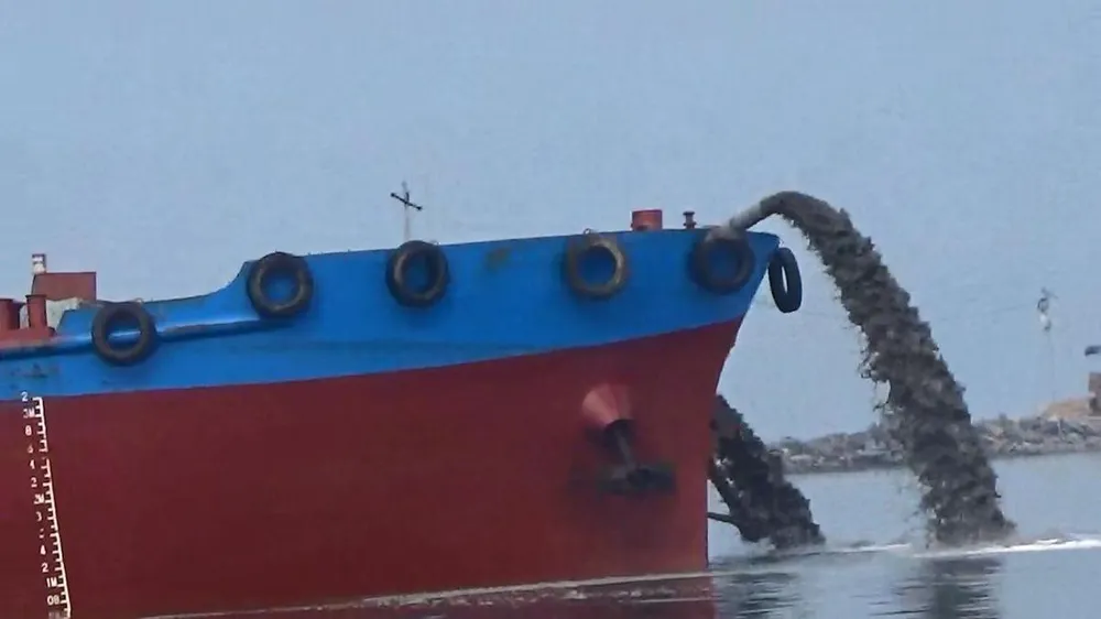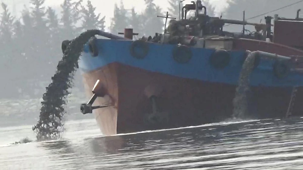 Tàu chở đầy cát xả xuống san lấp tại khu Đa Phước, Đà Nẵng. Ảnh: QT