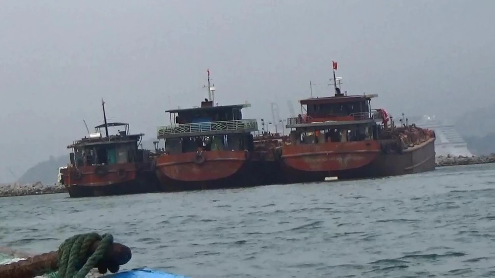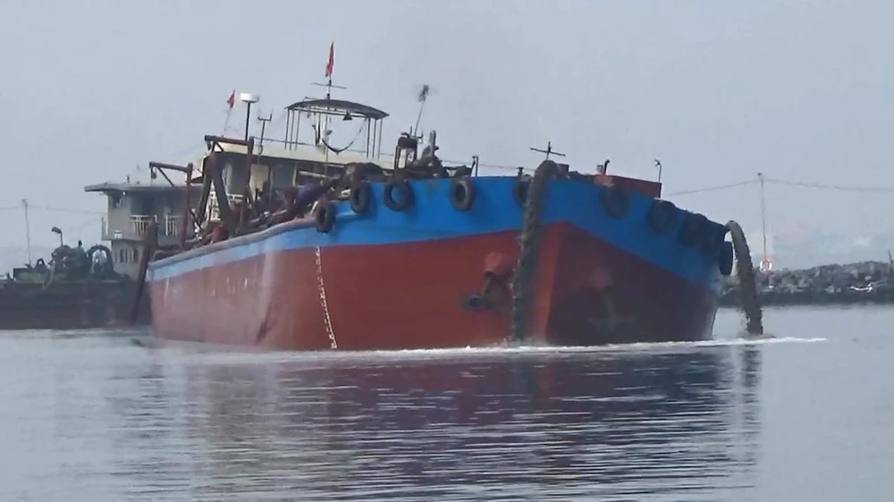 Cả một đội tàu chuyên hút cát từ Cửa Đại mang về Đà Nẵng. Ảnh: QT