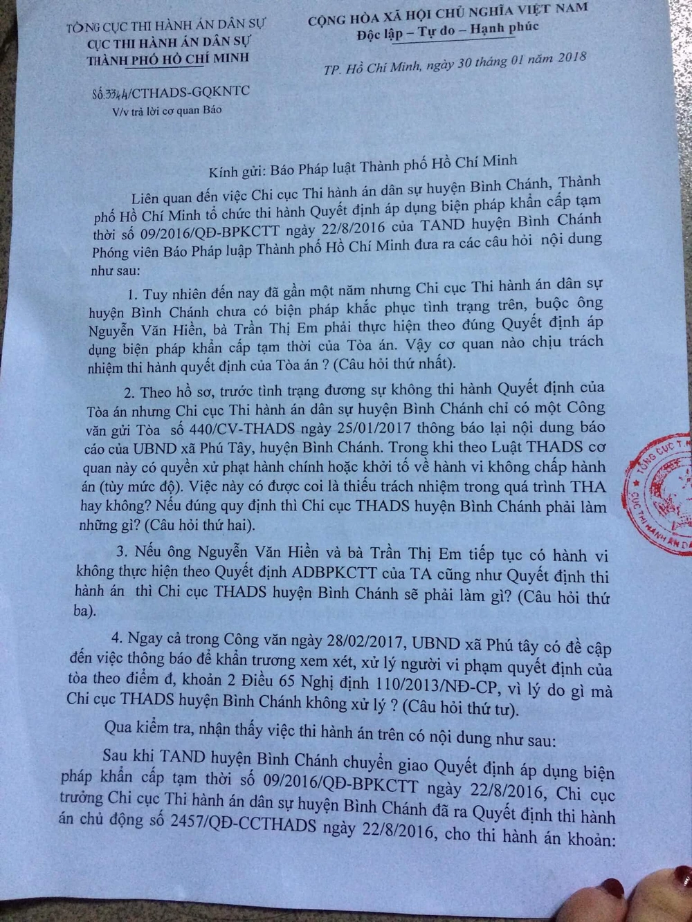 Văn bản của Cục THADS TP gửi báo Pháp Luật TP.HCM