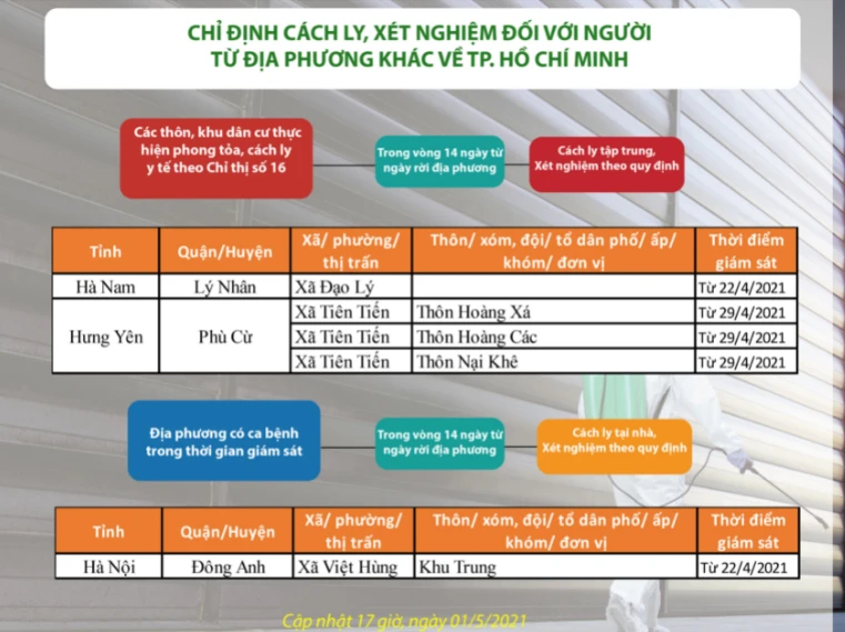 (PLO)- Tối 1-5, Trung tâm Kiểm soát bệnh tật TP.HCM ra thông báo chỉ định cách ly, xét nghiệm SARS-CoV-2 đối với những người sống trong địa bàn có ca bệnh COVID-19 thuộc Hà Nam, Hưng Yên, Hà Nội khi vào TP.HCM.