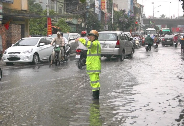 Lực lượng CSGT Hà Nội phân luồng giao thông sau cơn mưa lớn vào đêm 24 rạng sáng 25-5 vừa qua
