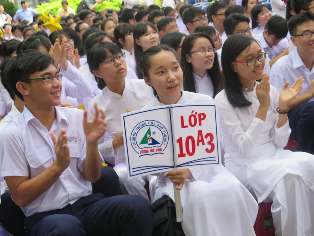Niềm vui của học sinh đầu cấp Trường THPT Lương Thế Vinh, quận 1 trong năm học mới. Ảnh: PHẠM ANH