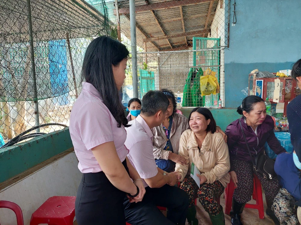 Ông Đoàn Ngọc Chung, Giám đốc Chi nhánh NHCSXH TP Đà Nẵng và lãnh đạo công đoàn cơ sở thăm hỏi gia đình có người mất trong mưa lũ vào tối 14-10. |