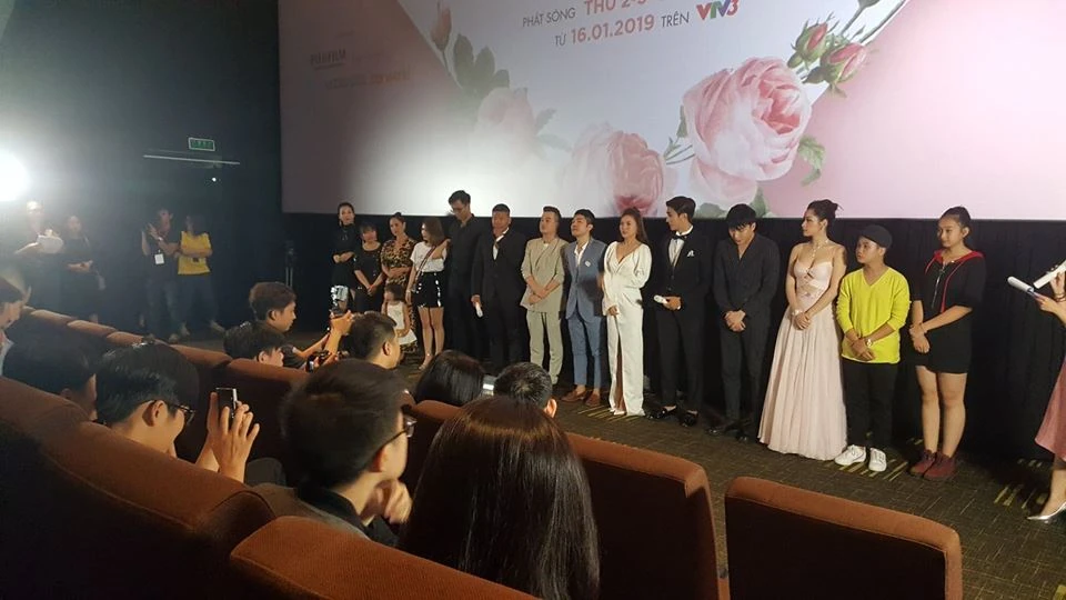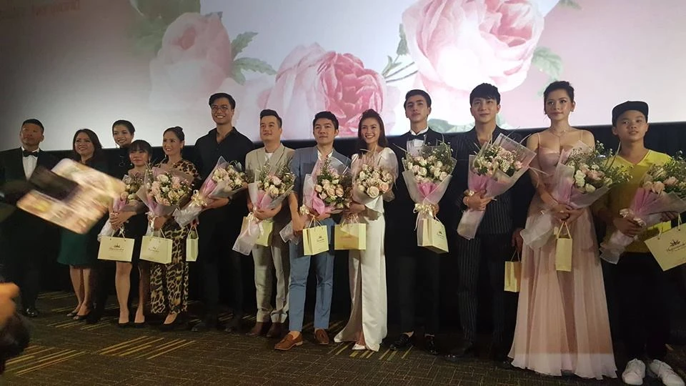 Các diễn viên và nhà sản xuất trong buổi ra mắt phim tối ngày 9-1. Đây là bộ phim được đầu tư rất lớn về kinh phí, khoảng 500 triệu mỗi tập. Ảnh: HM