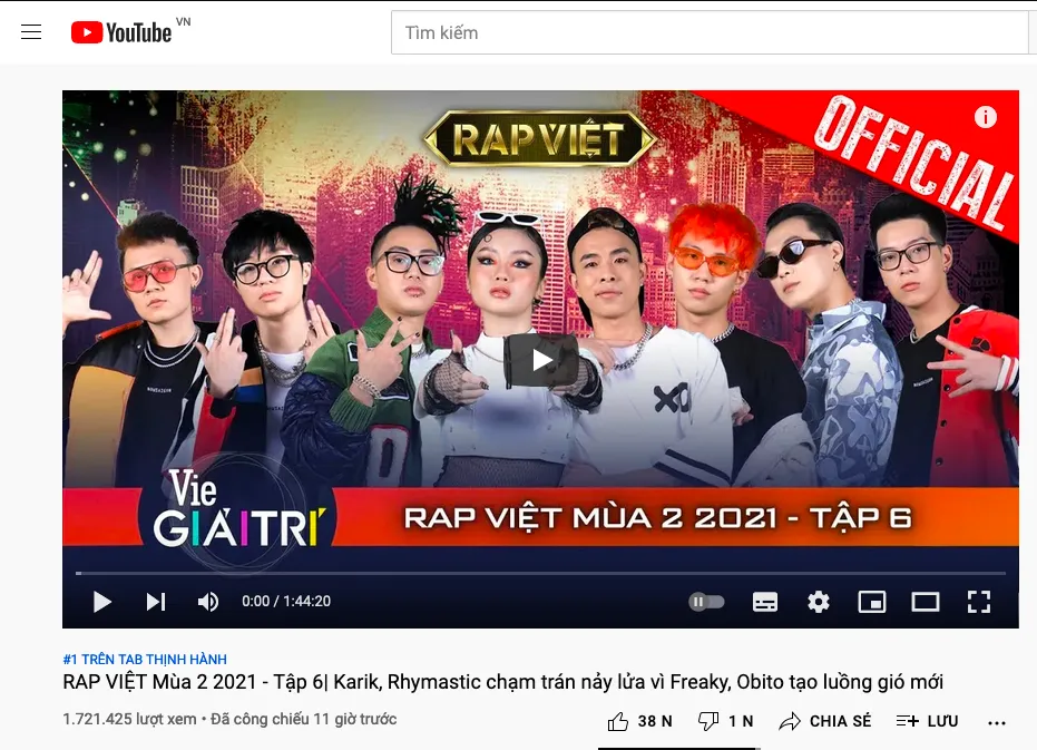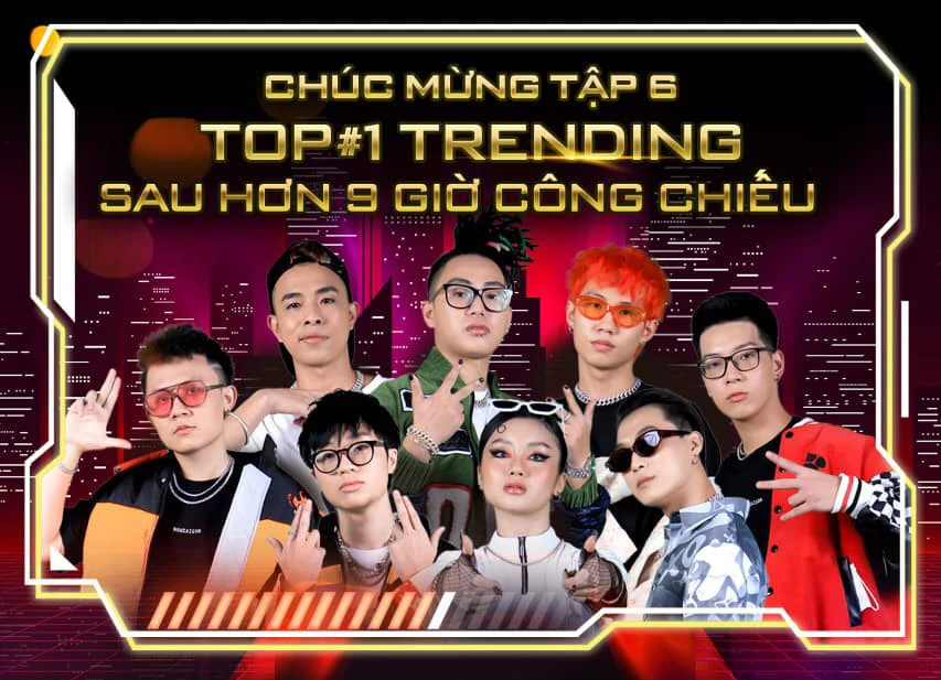 Với tình cảm và sự ủng hộ mạnh mẽ từ các fan tập 6 Rap Việt mùa 2 đã vượt qua nhiều đối thủ nặng ký để nắm giữ vị trí tốp 1 Youtube trending sau hơn 9 giờ công chiếu.