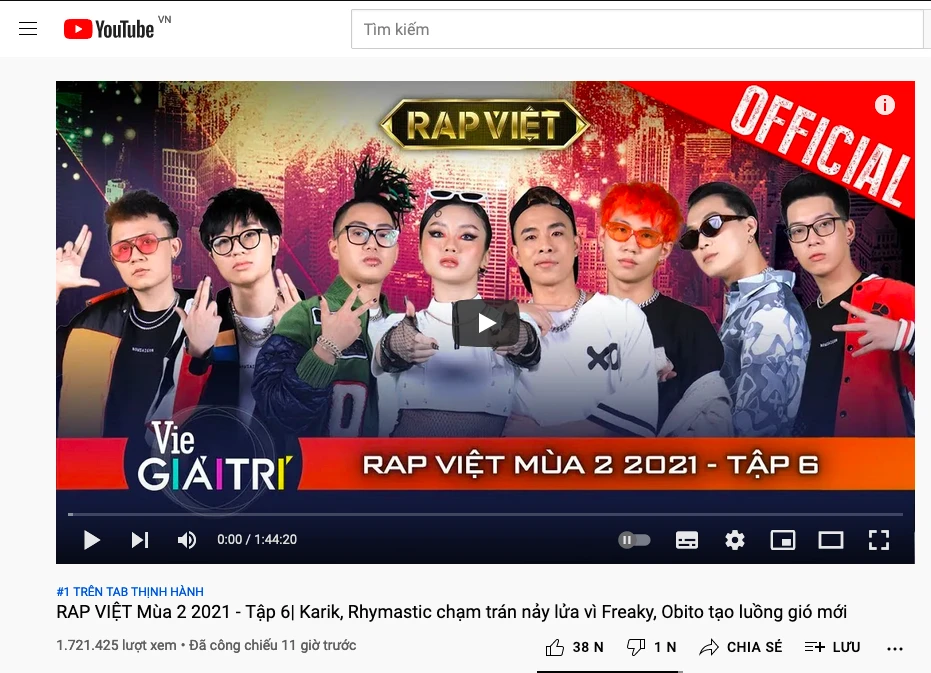 Rap Việt tập 6 mùa 2 đạt tốp 1 thịnh hành.