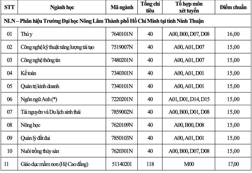 Trường ĐH Nông lâm TP.HCM, năm nay có điểm chuẩn từ 15 đến 26 điểm.
