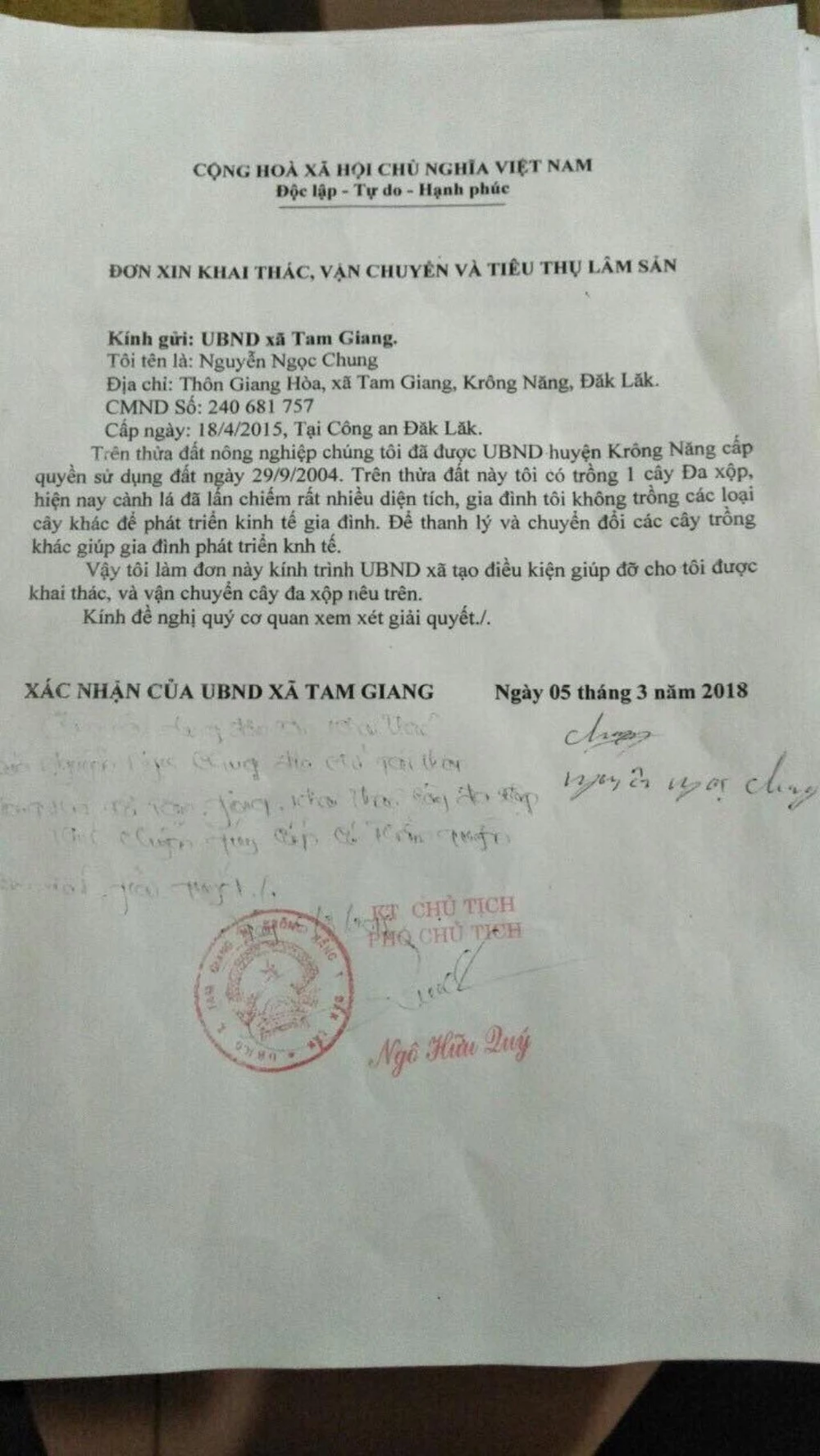 Cụ thể, ngày 5-3, ông Chung có đơn xin khai thác, vận chuyển, tiêu thụ lâm sản gửi UBND xã Tam Giang.
