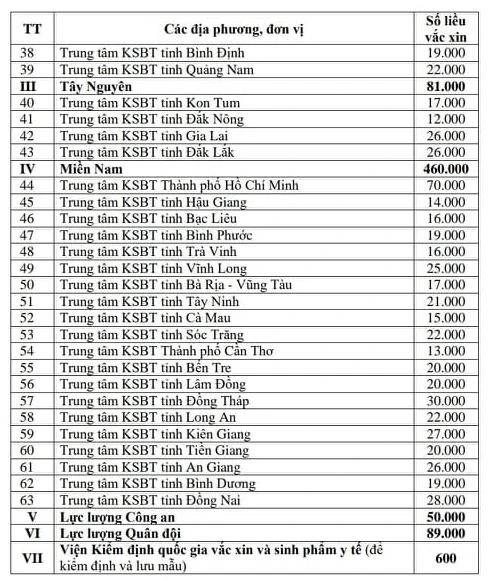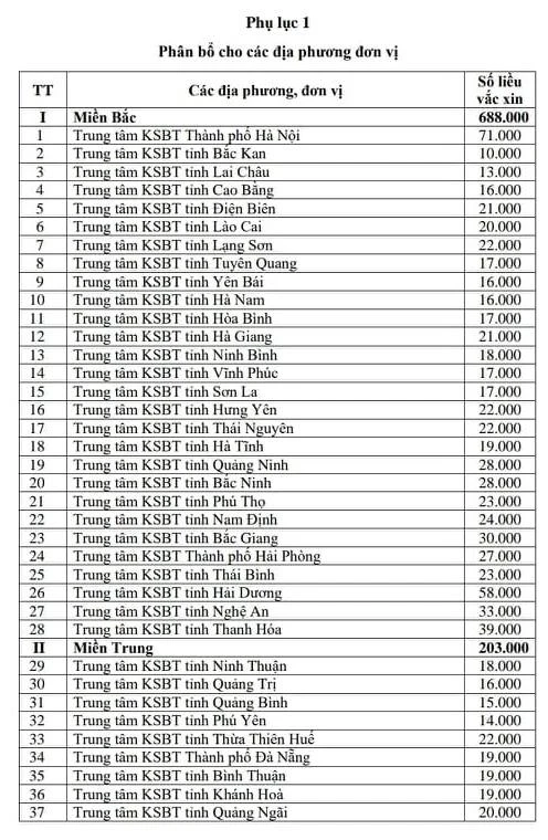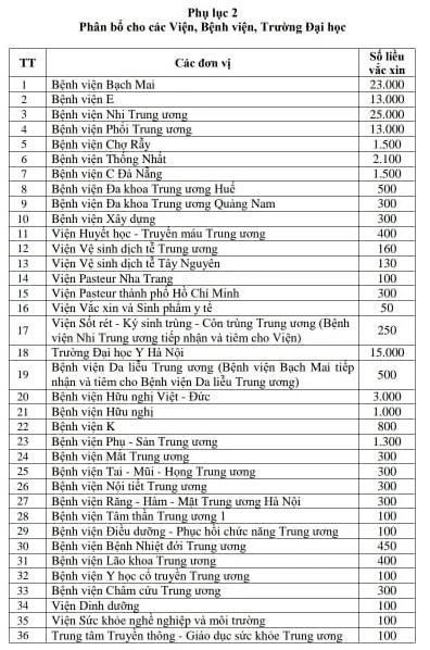Vaccine sẽ được đưa về Trung tâm Kiểm soát bệnh tật các tỉnh, thành phố, lực lượng Quân đội, Công an, các viện, bệnh viện, trường đại học và đơn vị trực thuộc Bộ Y tế theo phụ lục đi kèm.