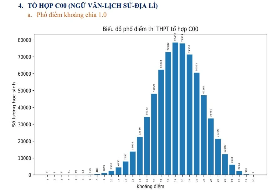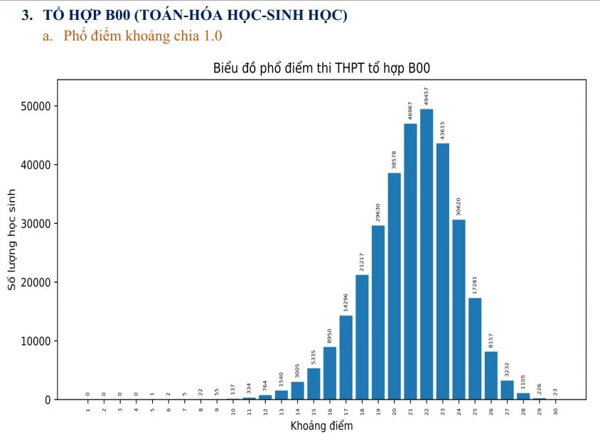 Từ dữ liệu này, Bộ cũng đã có thống kê cụ thể phổ điểm thi theo từng tổ hợp môn thi dùng để xét tuyển vào ĐH-CĐ năm 2023.