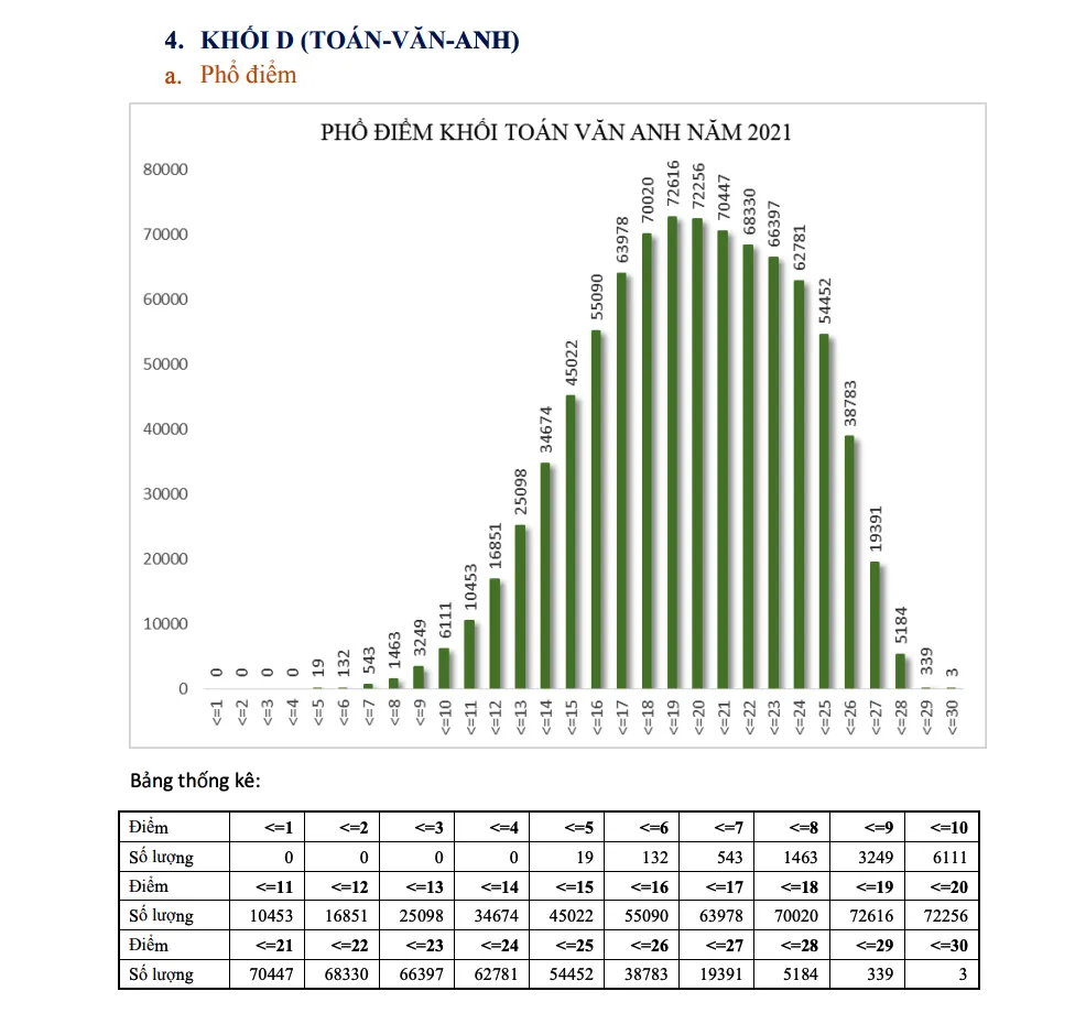 Ở khối D, có ba thí sinh đạt 30 điểm, điểm tập trung ở mức từ 15 cho đến 27 điểm trong đó có 72.616 thí sinh được 19 điểm, 72.256 thí sinh đạt 20 điểm và 70.447 thí sinh đạt 21 điểm.