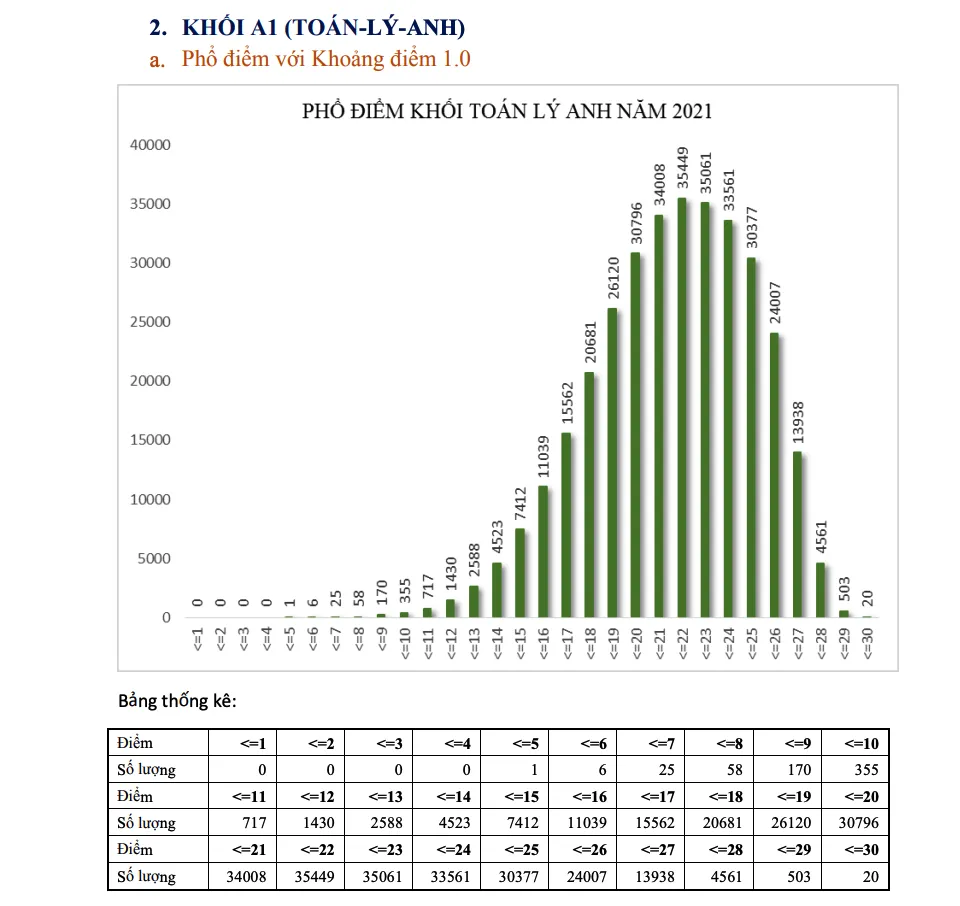 Khối A1 điểm cao tập trung từ khoảng 19 đến 26 điểm, tổng điểm có nhiều thí sinh đạt nhất là 21 điểm với 35449 thí sinh.