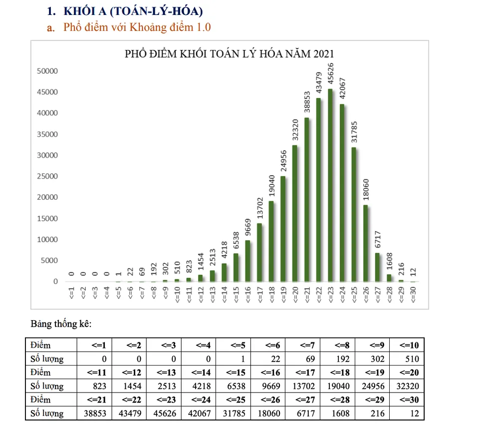 Khối A với ba môn Toán, Lý, Hoá có điểm dao động ở khoảng từ 20-25 điểm, trong đó thí sinh đạt 23 điểm nhiều nhất với 45.626 thí sinh, 43.479 thí sinh đạt 22 điểm 42.016 thí sinh đạt 24 điểm và có 12 thí sinh đạt 30 điểm.