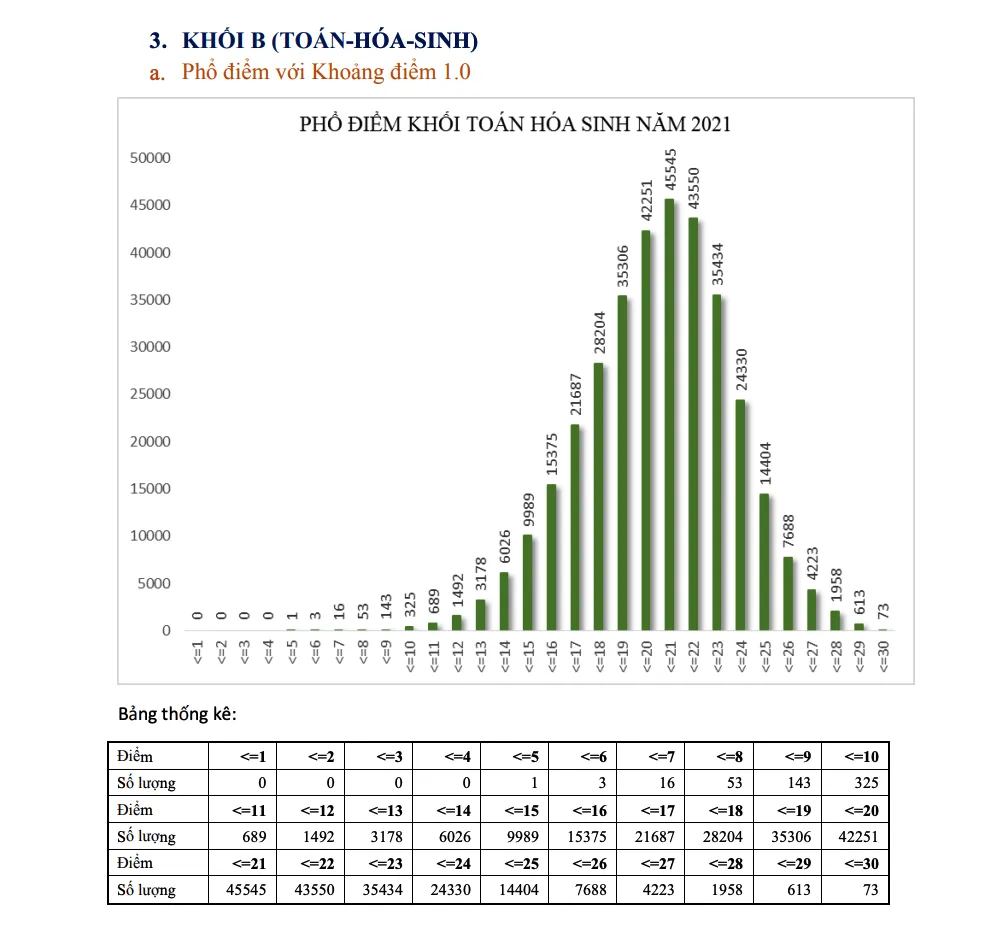 Khối B: dao động điểm ở khoảng từ 19-24 điểm, nhiều nhất là 45.545 thí sinh đạt 21 điểm khối B, hơn 43.000 thí sinh đạt 22 điểm. 73 thí sinh đạt điểm tối đa ở khối thi này.