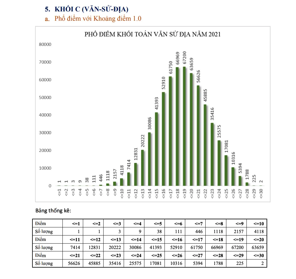 Khối C có hai thí sinh đạt 30 điểm, số điểm của khối C năm nay được đánh giá là thấp so với các khối còn lại. Điểm dao động từ 14 cho đến 24 điểm, trong đó cao nhất là 19 điểm với 67.200 thí sinh, 18 điểm có 66.969 thí sinh.