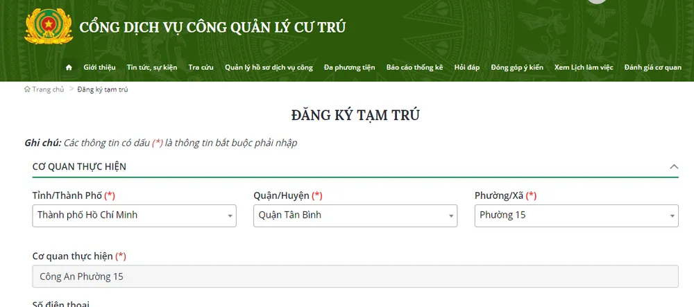 Bước 2: Chọn Dịch vụ công là thường trú, tạm trú. Hệ thống sẽ chuyển đến trang hồ sơ đăng ký thường trú, tạm trú.