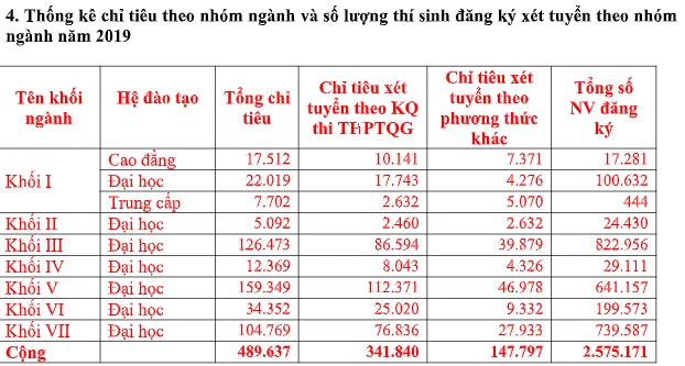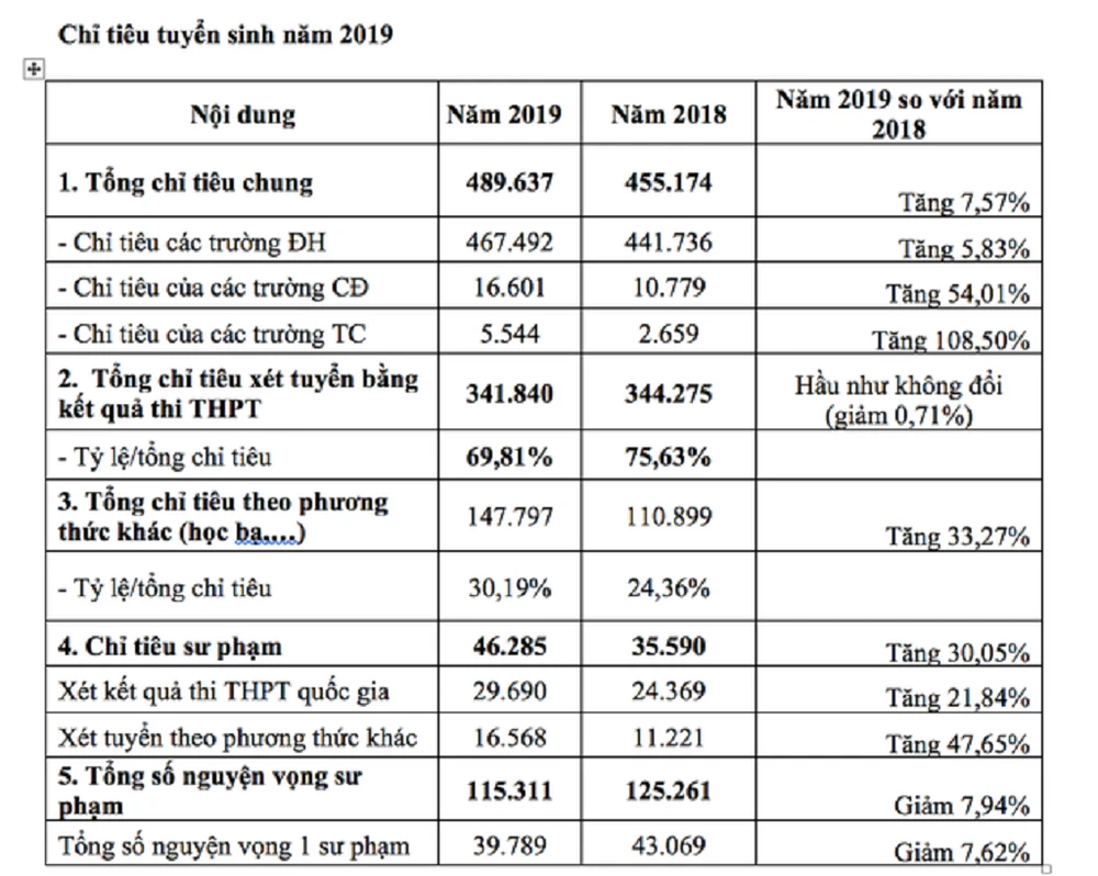 Theo bà Phụng, theo thống kê của Bộ GD&ĐT, số thí sinh dự thi THPT quốc gia năm nay là hơn 887.000, giảm gần 40.000 so với năm 2018. Trong đó, hơn 653.000 em đăng ký xét tuyển đại học, cao đẳng. Chỉ tiêu tuyển sinh vào các trường đại học tăng gần 7,6%, tương đương gần 490.000. Trong đó, chỉ tiêu sư phạm là 46.285, tăng hơn 30% so với năm ngoái.