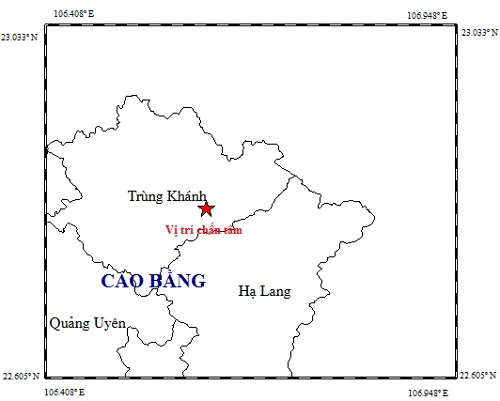 Vị trí chấn tâm trận động đất tại huyện Trùng Khánh lúc 10 giờ 56 phút. Ảnh: VVLĐC