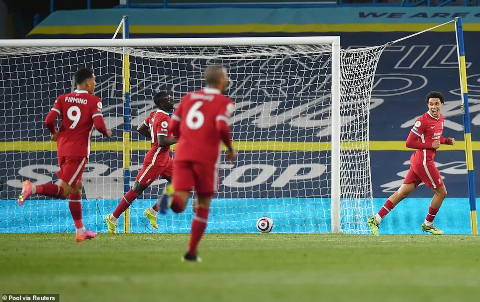 Đến phút 31, Liverpool cũng có được bàn thắng vươn lên dẫn trước do công của Mane. Từ tình huống Jota phất bóng cho Arnold thoát xuống vòng cấm, thủ môn Meslier nhanh chóng băng ra gây áp lực. Nhưng hậu vệ người Anh đã kịp nhanh chân thực hiện đường căng ngang, để Mane dứt điểm vào lưới trống đưa Liverpool vươn lên dẫn trước 1-0.