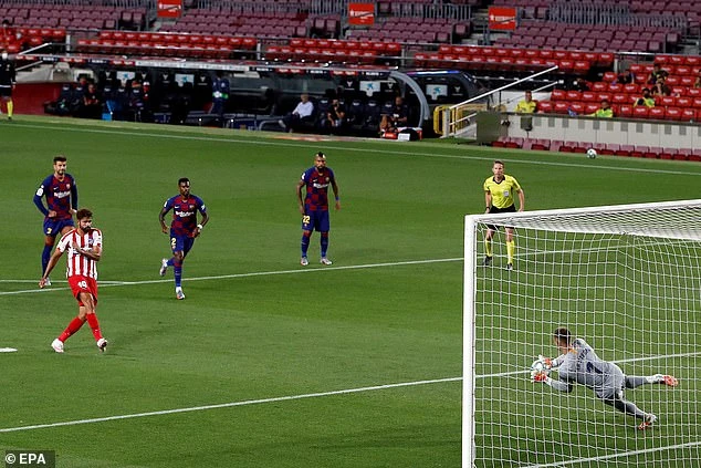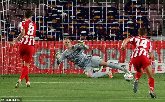 Tuy nhiên đồng đội của Costa là Saul lại dễ dàng đánh bại Ter Stegen để giúp Atletico Madrid gỡ hoà 1-1. Ảnh: Reuters.