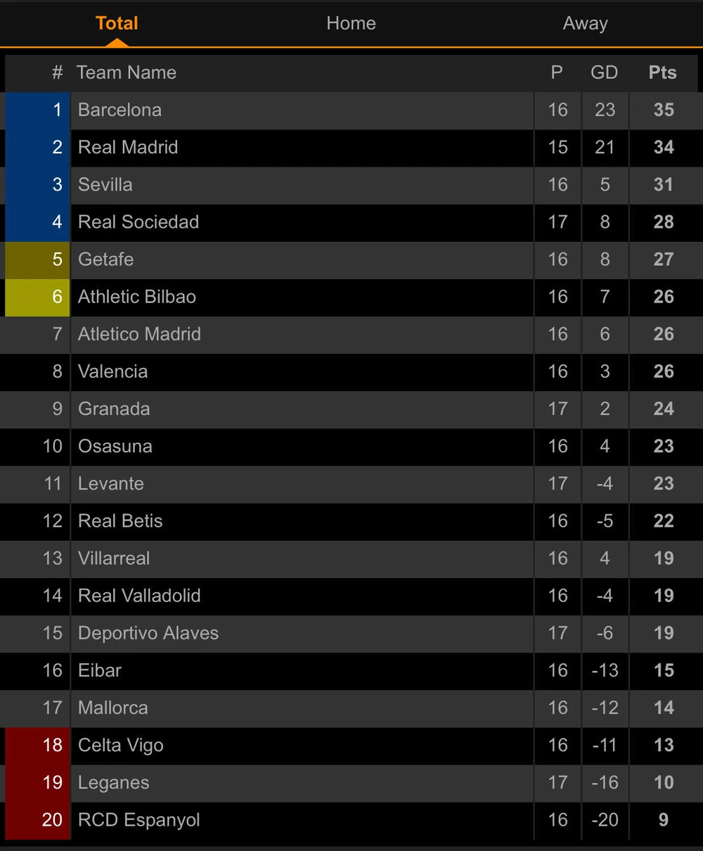 Để Real Sociedad cầm hòa với tỉ số 2-2, Barcelona vẫn giữ được ngôi đầu với 35 điểm sau 16 vòng đấu. Tuy nhiên, vị trí đầu bảng của Barca có thể bị uy hiếp bởi kình địch Real Madrid nếu như đội bóng hoàng gia giành chiến thắng trong chuyến làm khách đến sân của Valencia.