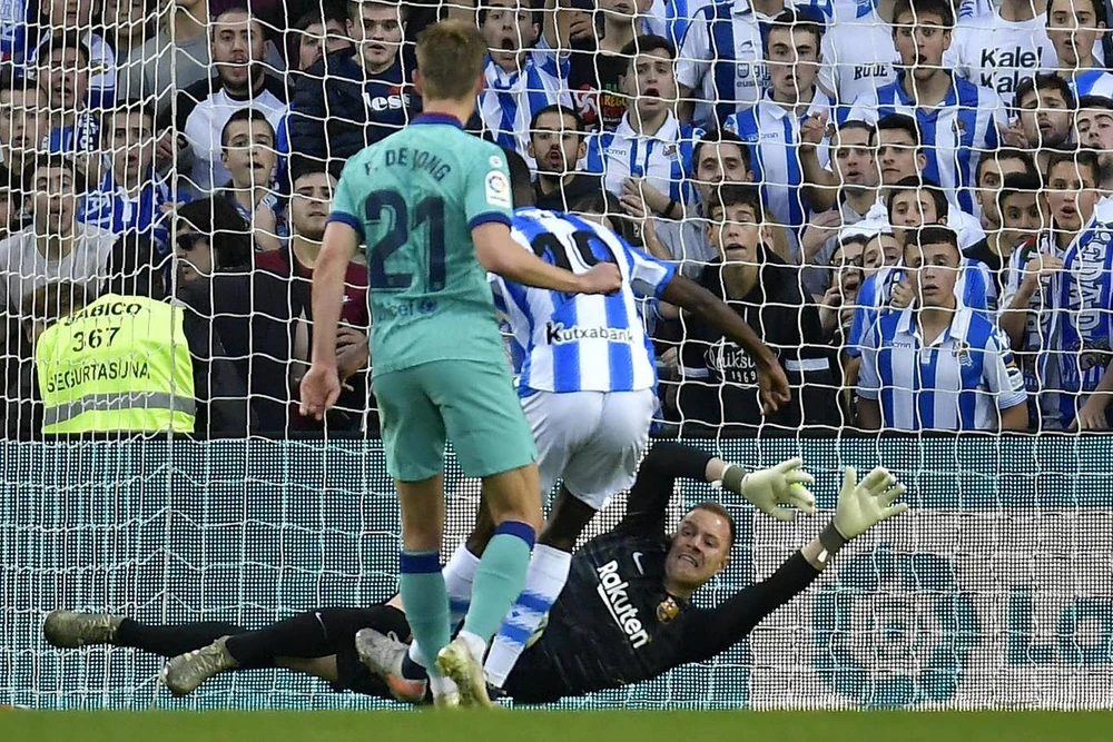 Tuy nhiên, thầy trò Valverde gặp phải Real Sociedad có lối chơi quả cảm ngay từ khi nhập cuộc và Barca sớm phải nhận “gáo nước lạnh” ngay từ phút thứ 10 từ đội chủ nhà. Từ tình huống Real Sociedad đá phạt góc, Busquets phạm lỗi kéo áo với Diego Llorente khiến Barca phải chịu phạt đền. Trên chấm 11 m, Mikel Oyarzabal dễ dàng đánh bại thủ môn Ter Stegen để mở điểm cho Real Sociedad.