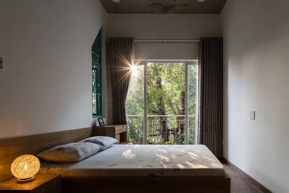 Phòng ngủ của gia chủ gắn kết với thiên nhiên bên ngoài. Ngoài ra, KTS còn thiết kế thêm lan can, nơi chủ nhà có thể thư giãn nhâm nhi tách trà vào buổi sáng.