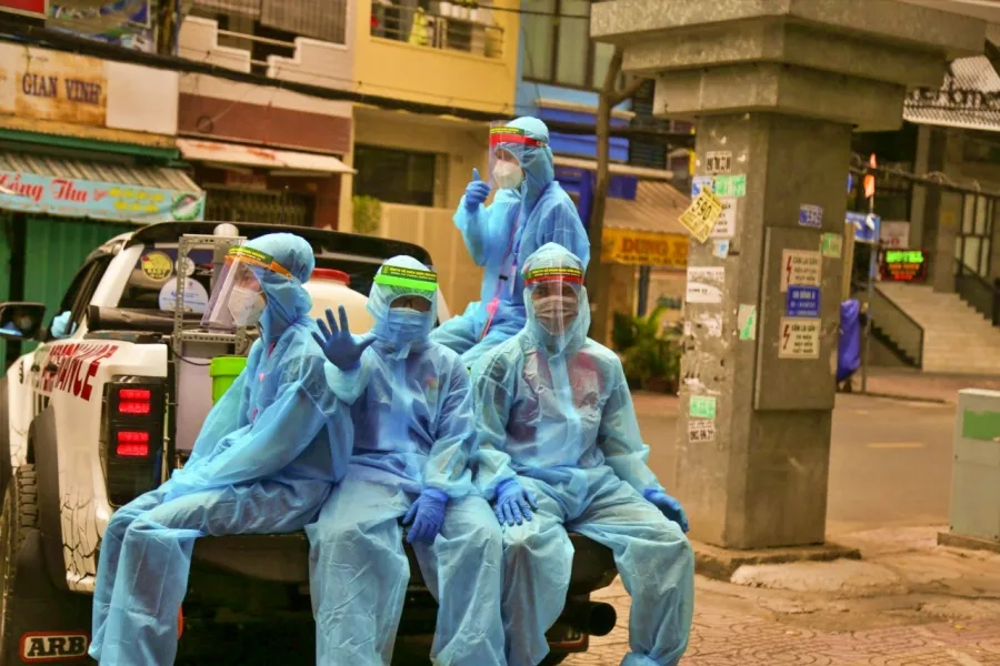 Đội của anh Hải được chia làm hai nhóm chịu trách nhiệm phun xịt khử khuẩn ở các điểm cách ly, ổ dịch: nhóm 1 hoạt động trên địa bàn TP Thủ Đức, nhóm 2 hoạt động ở các quận huyện còn lại.