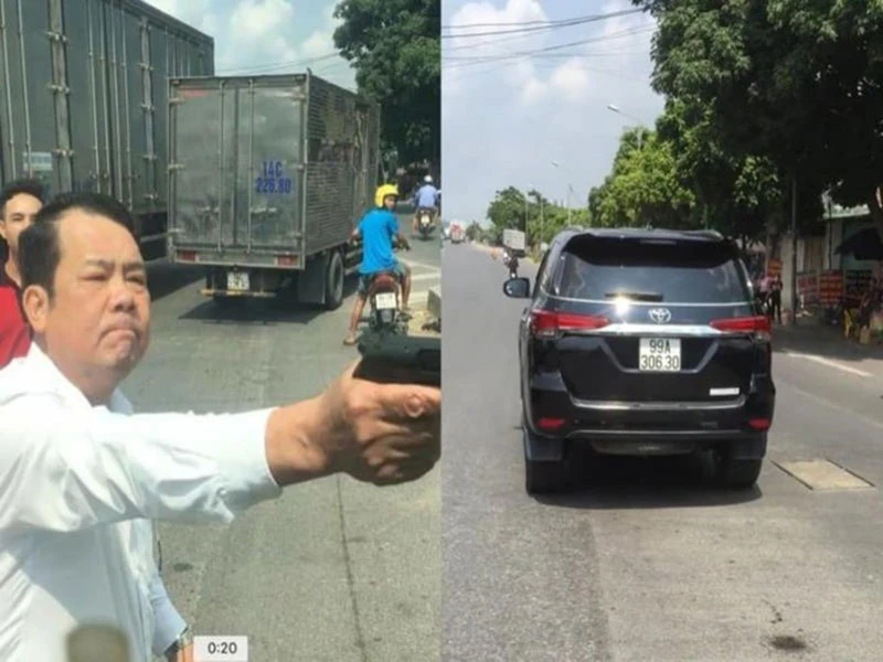 Hình ảnh ông Sướng xuống xe, rút súng đe dọa bắn tài xế xe tải. Ảnh: MXH