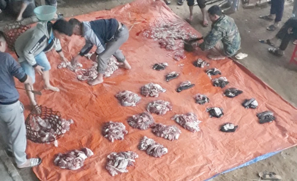 Trâu đã mổ ở nhà cô dâu nhưng hoãn đám cưới nên người dân, bà con xóm giềng đến sẻ chia, mua giúp thịt trâu.