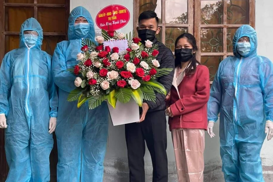 Lãnh đạo thị trấn Thanh Chương mang hoa và quà vào khu cách ly chúc mừng hạnh phúc anh Nguyễn Khắc Phước và chị Đoàn Thị Mơ- hoãn tổ chức cưới vào trưa 29-1.