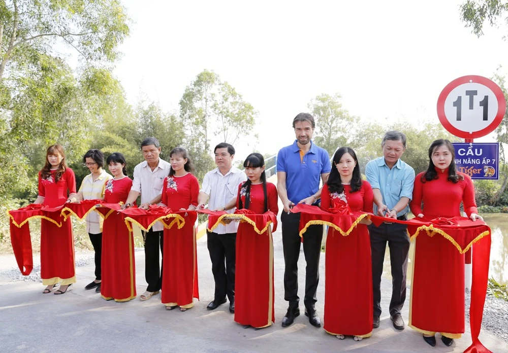 Đại diện nhãn hàng Tiger Beer cùng chính quyền, người dân địa phương lên cắt băng khánh thành cầu “Kênh Năng Ấp 7”