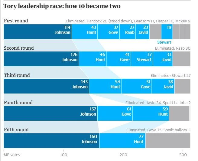 Hơn chục ứng cử viên đã được đưa ra và trong cuộc bỏ phiếu lần thứ năm, cũng là đợt bỏ phiếu cuối cùng của Đảng Bảo thủ, ông Boris Johnson với 160 phiếu ủng hộ đã loại bỏ Bộ trưởng Môi trường Anh Michael Gove (75 phiếu), và bỏ xa vị trí thứ hai của Ngoại trưởng Jeremy Hunt (77 phiếu).