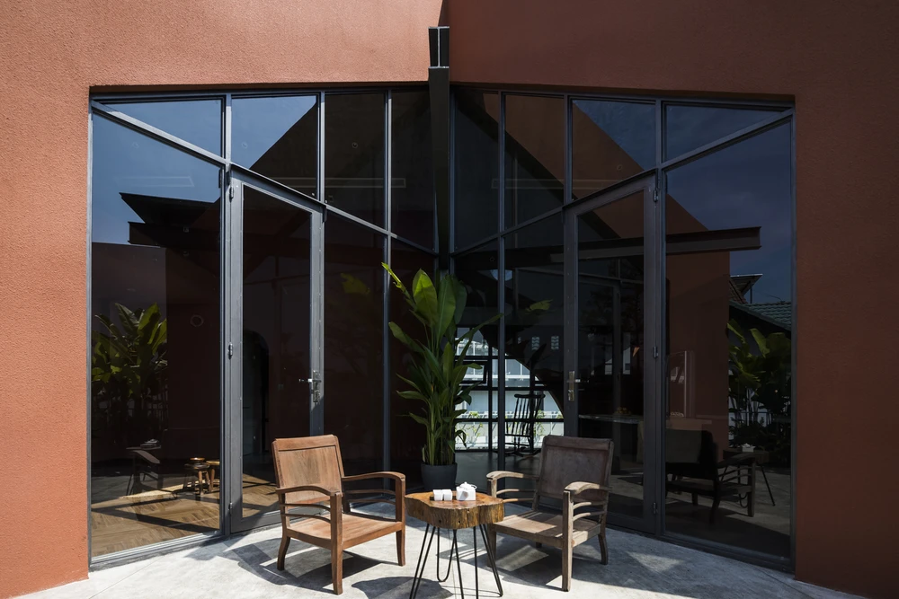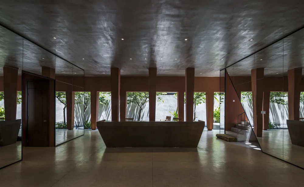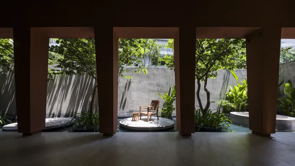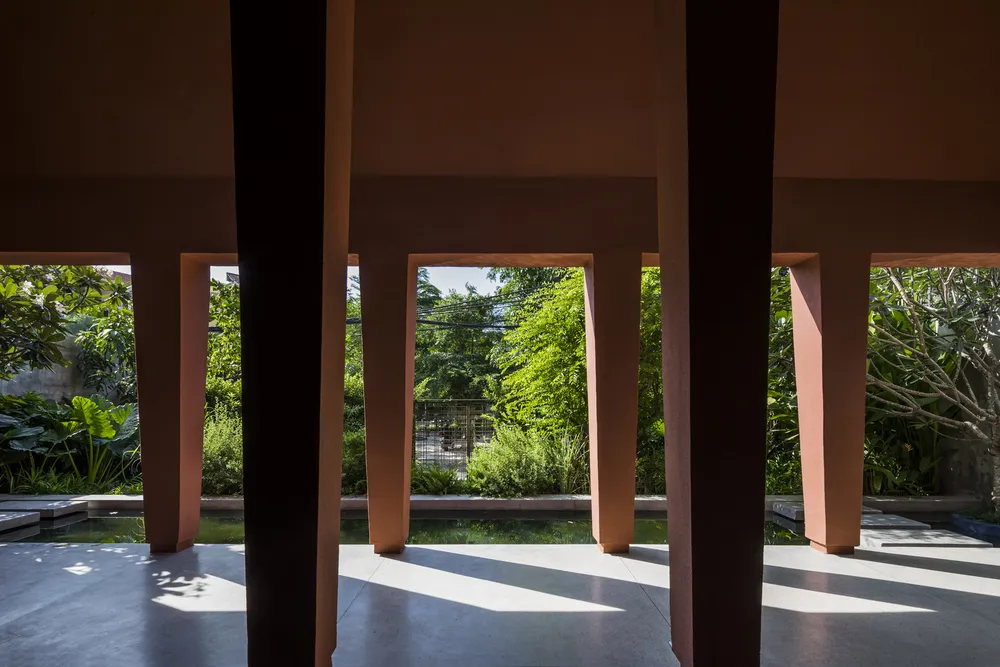 Hệ thống các cột trụ bao quanh giúp lớp ngăn cách không gian bên trong và bên ngoài bị xóa mờ.