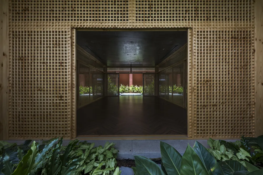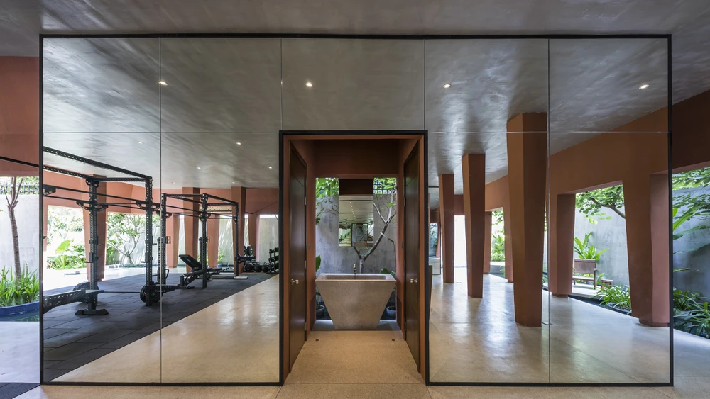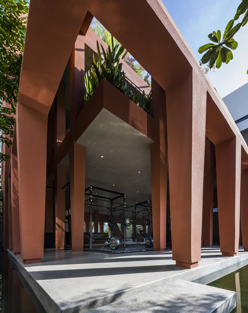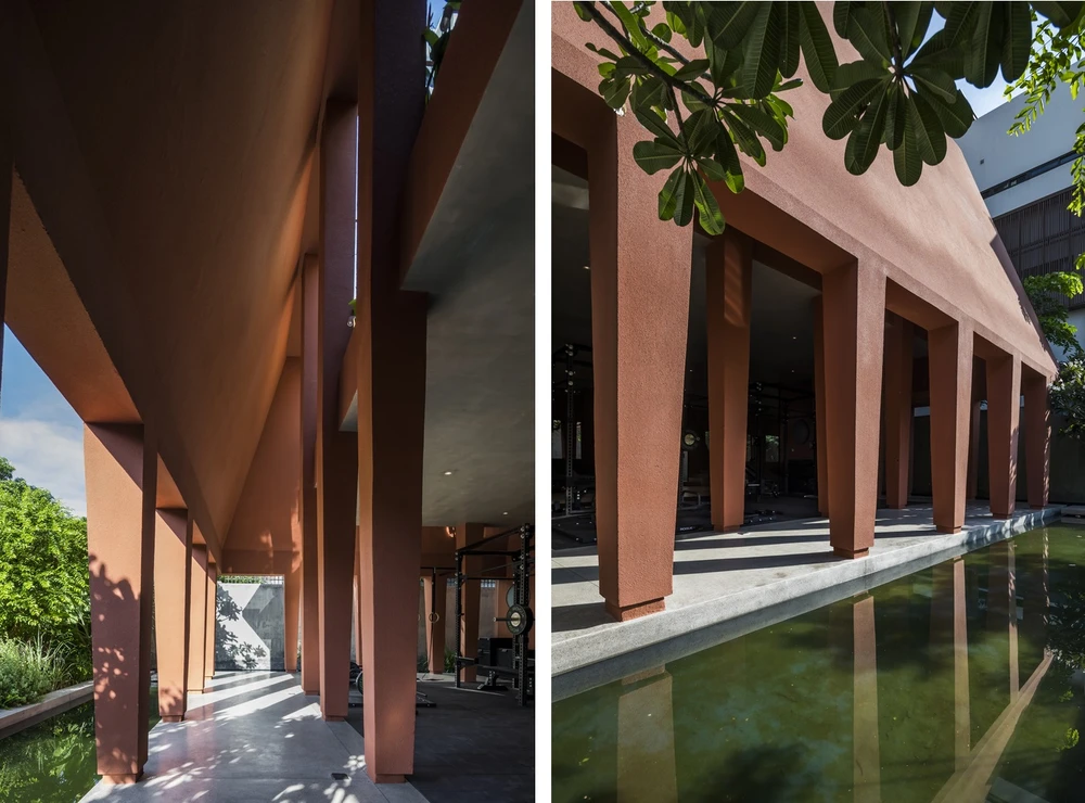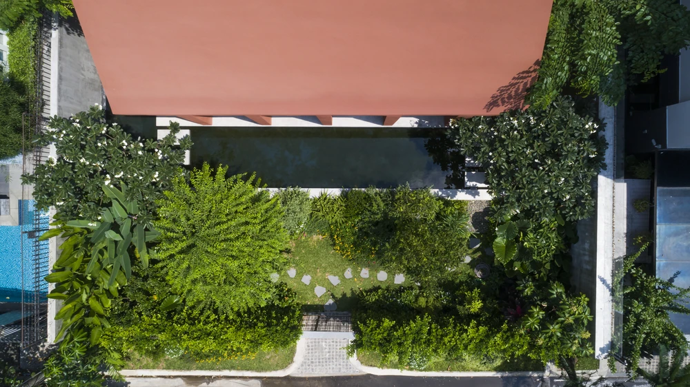 Nhóm thiết kế đã trồng nhiều cây xanh và thiết kế hồ bơi nhằm giảm lượng nhiệt vào không gian nhà.