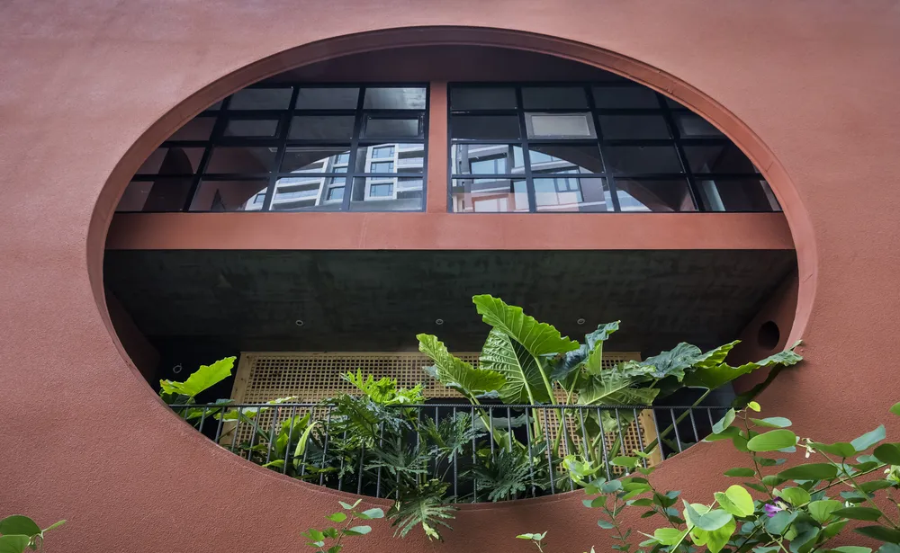 Ngôi nhà không chỉ ấn tượng với lớp gạch màu đỏ mà còn gây ấn tưởng bởi chiếc cổng được bao phủ bởi cây xanh.