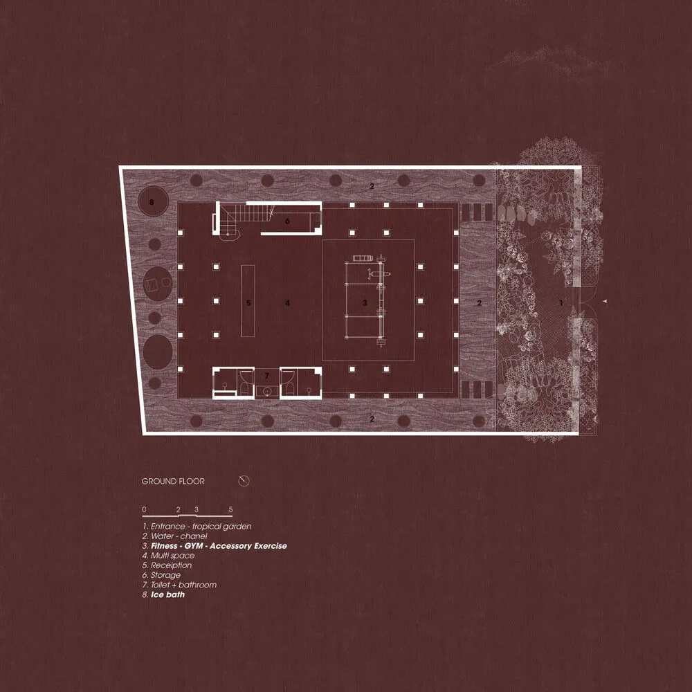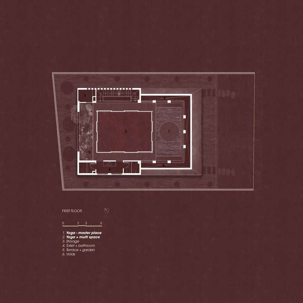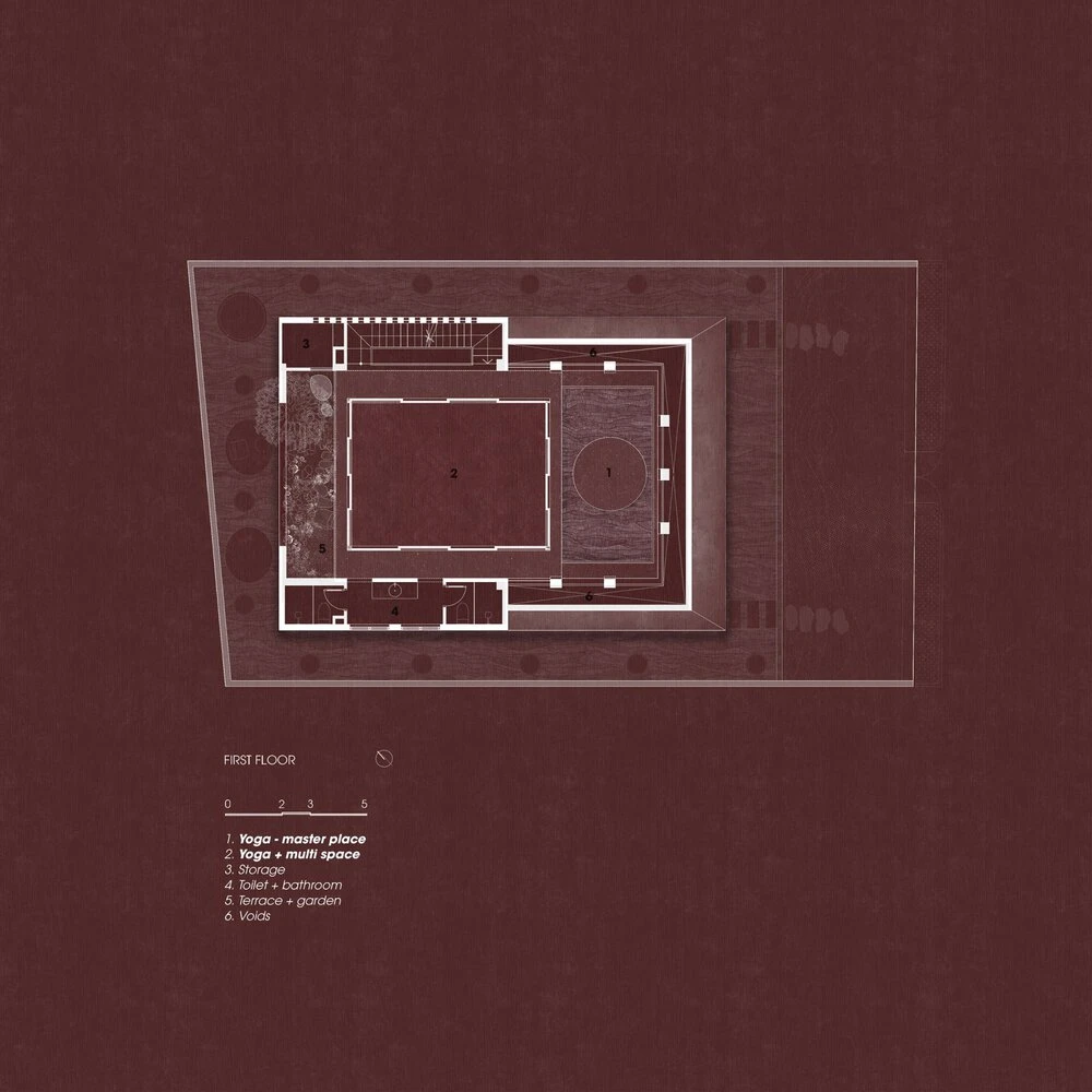 Tầng một, không gian được sử dụng cho yoga. Không gian hoàn toàn trống nhưng đòi hỏi không gian phải yên tĩnh và khép kín khi cần thiết.